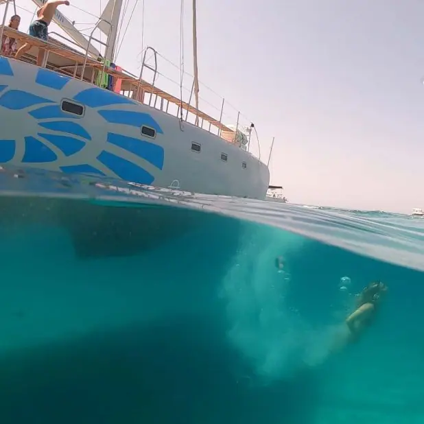 Ensuite, le catamaran mettra le cap sur Cala Vella, une plage idyllique aux eaux cristallines, où l’équipage sera à votre disposition pour tout ce dont vous pourriez avoir besoin pendant que vous profitez de la baignade et de la détente dans ce lieu paradisiaque.